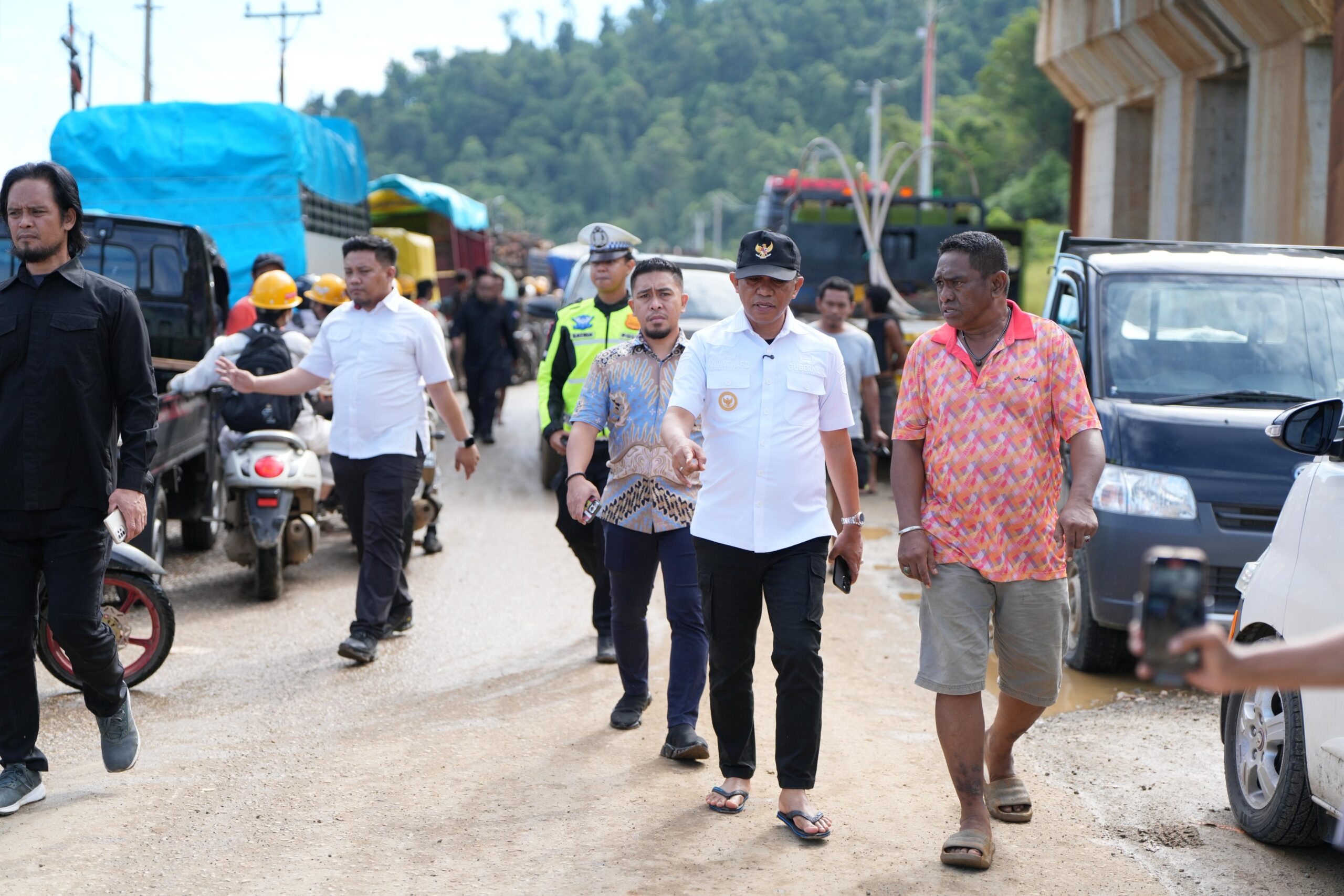 Saat meninjau Gubernur tampak berjalan kaki di tengah jalan rusak parah bersama masyarakat yang terjebak kemacetan panjang.