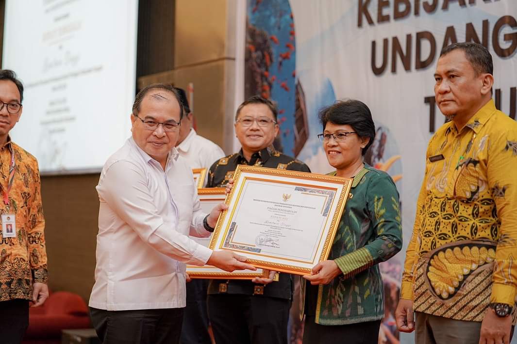 Deputi II Bidang Koordinasi Pemerataan Pembangunan Wilayah dan Penanggulangan Bencana Kemenko PMK RI Sorni serahkan pengharagaan kepada Plh Sekkab Sigi, Selvy, betempat di Hotel BW Plus Coco Palu, Jumat (14/6/2024). FOTO:DOK PROKOPIM PEMKAB SIGI